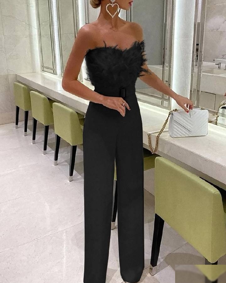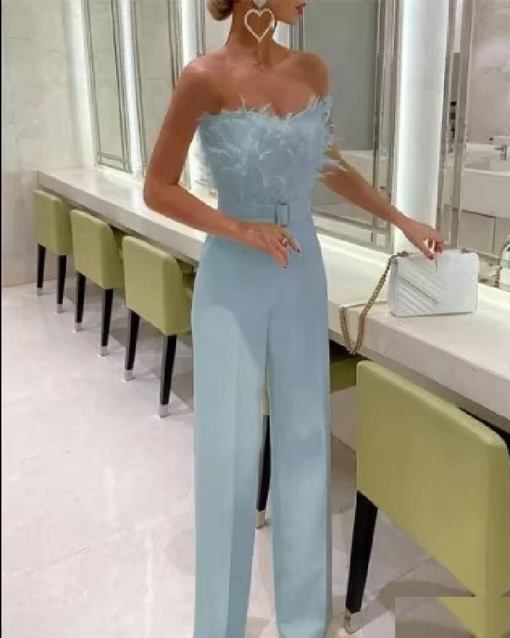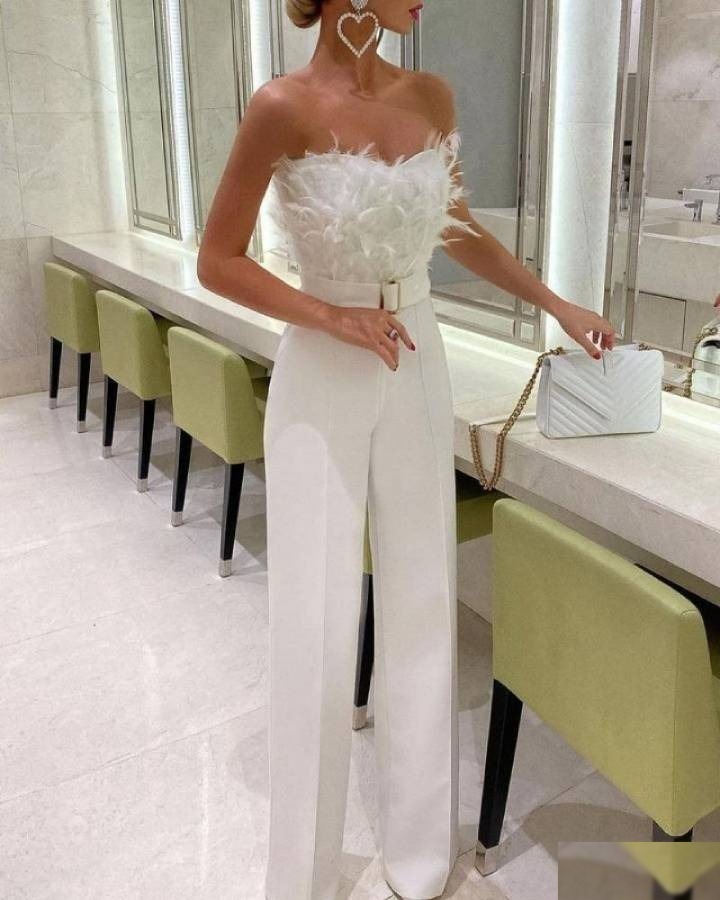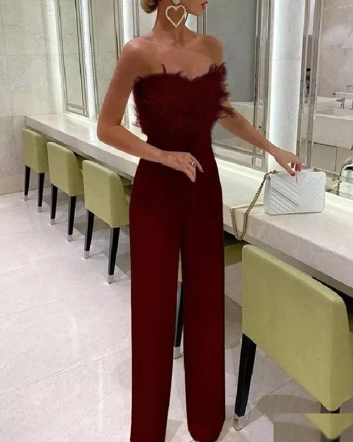 Plonge dans l’élégance avec cette combinaison à plumes, un choix audacieux et raffiné pour les occasions spéciales. Ce modèle sans bretelles met en val…