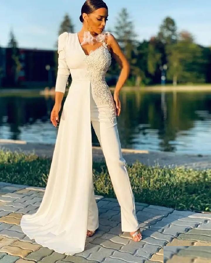 Cette combinaison asymétrique est une véritable pièce de caractère pour ton mariage. Elle marie avec audace une épaule structurée et une broderie déli…