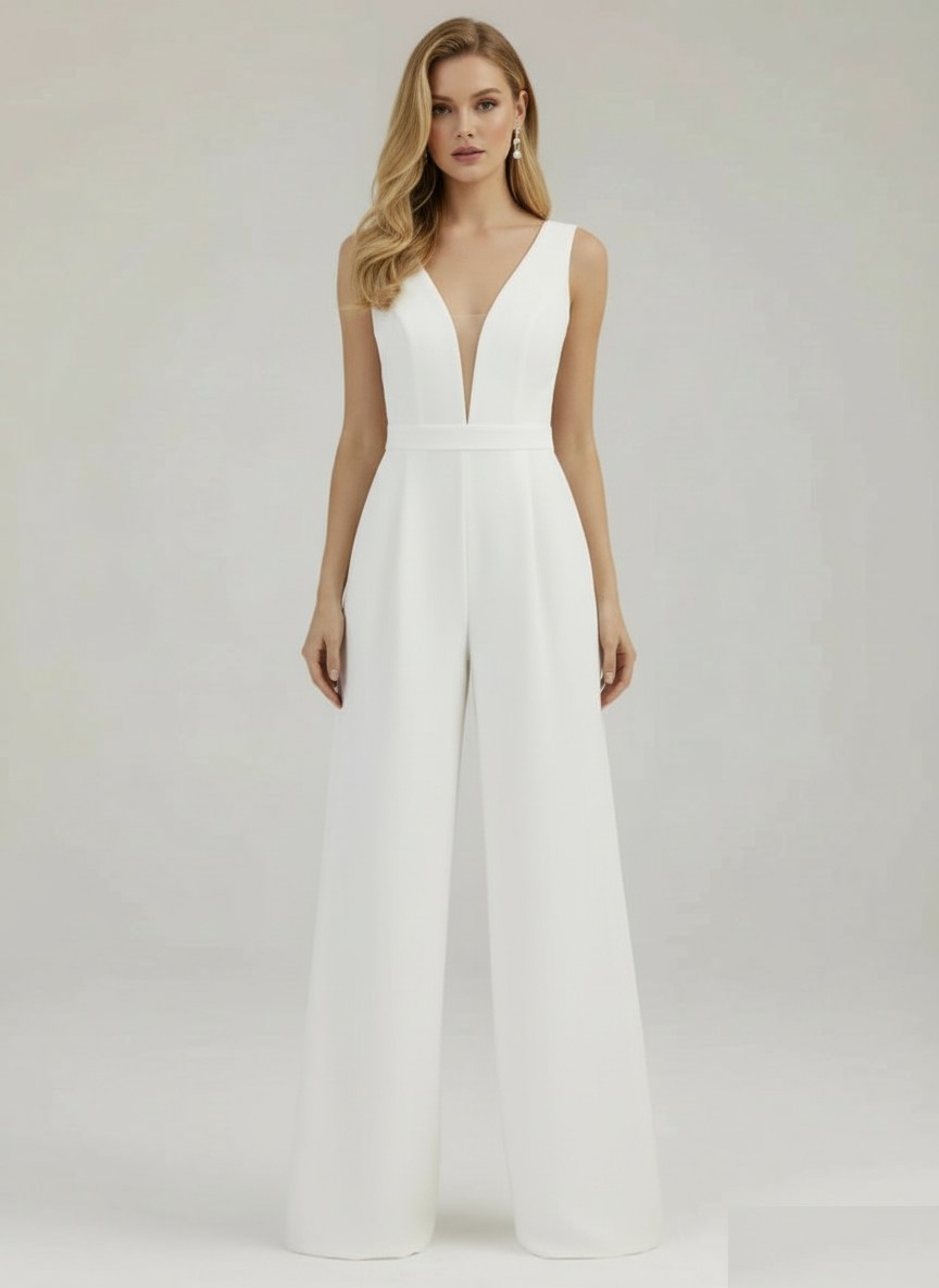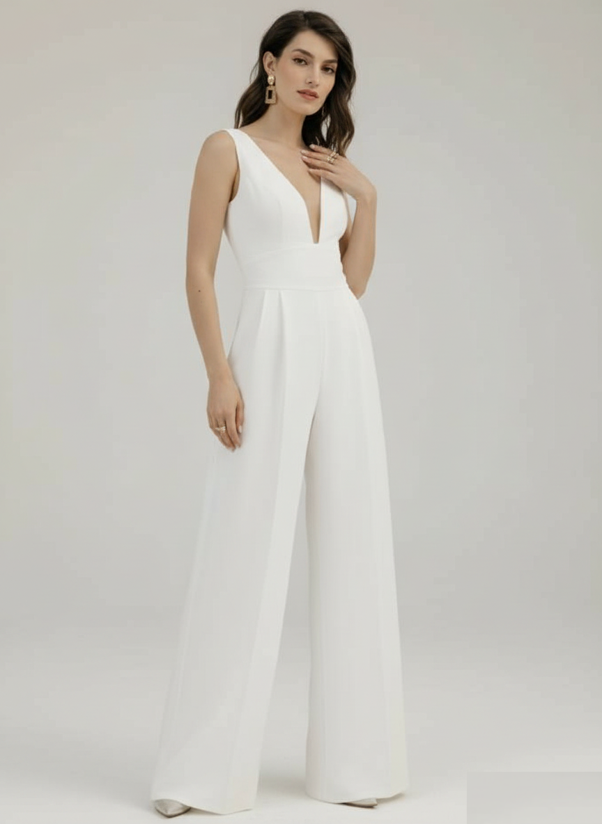 Succombe au charme épuré et sophistiqué de cette combinaison blanche, pensée pour ton mariage civil. Avec son décolleté plongeant subtilement audacieux…