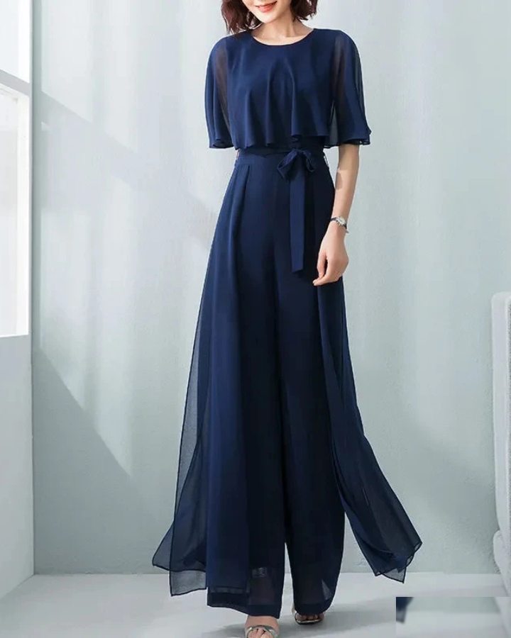 Confectionnée en polyester haute qualité, élasthanne (95% Polyester, 5% Élasthanne), cette combinaison offre un tombé impeccable et un confort absolu. Le style Fluide, Pantalon Large apporte une touche d’élégance intemporelle.