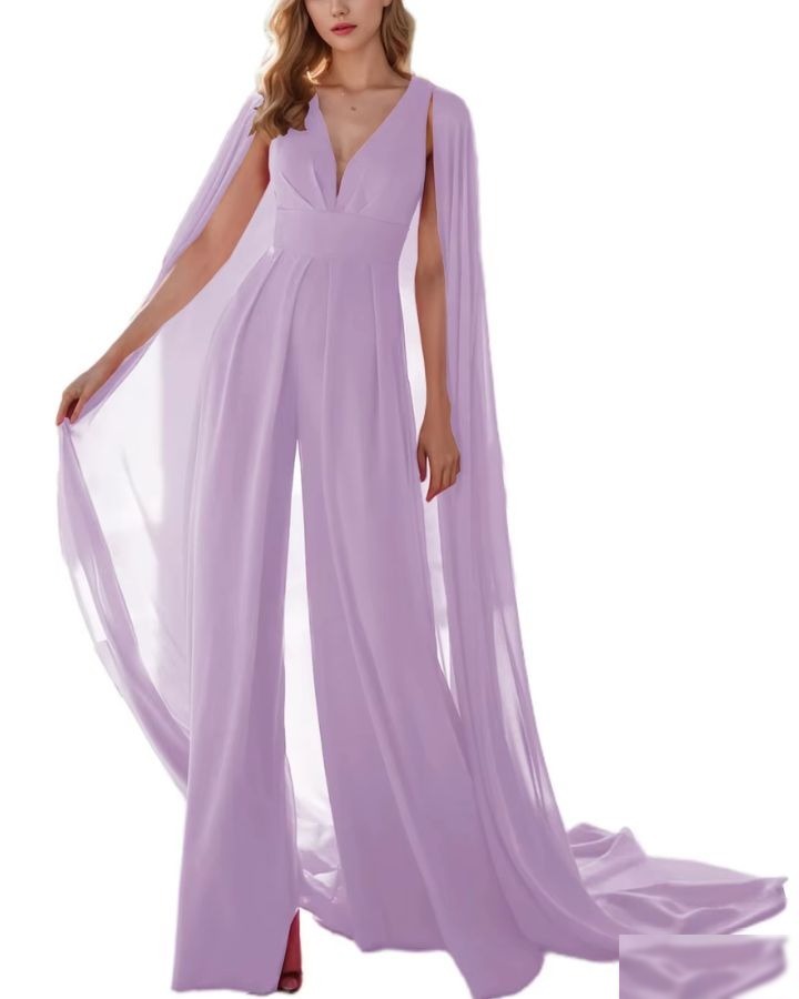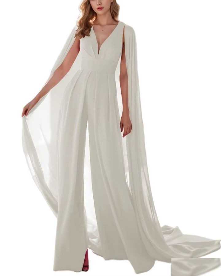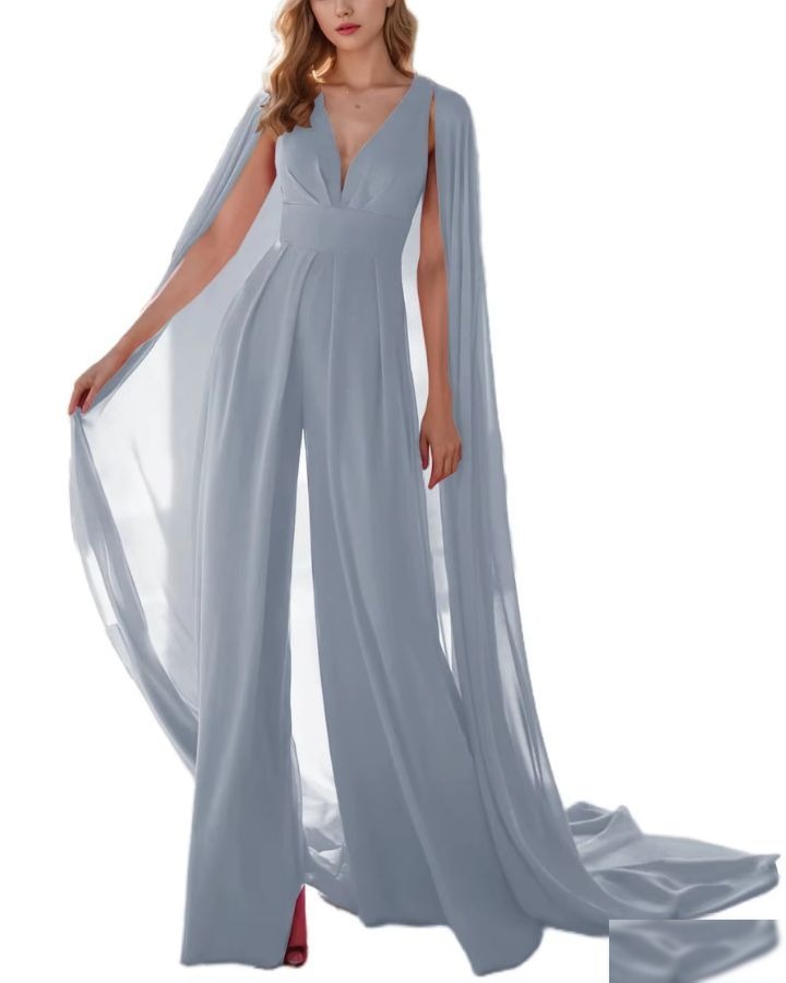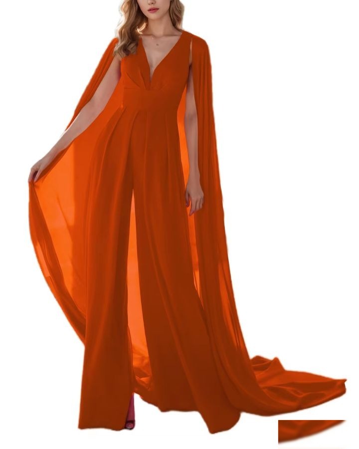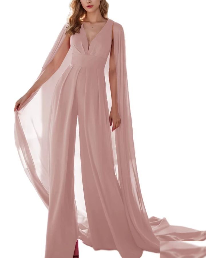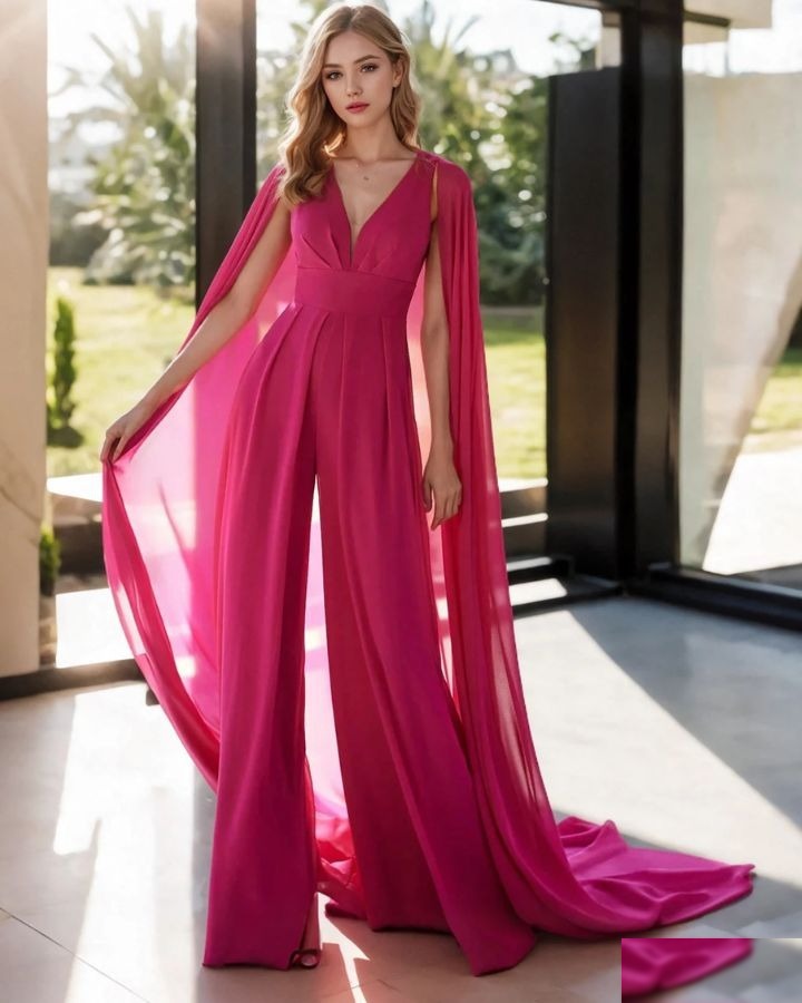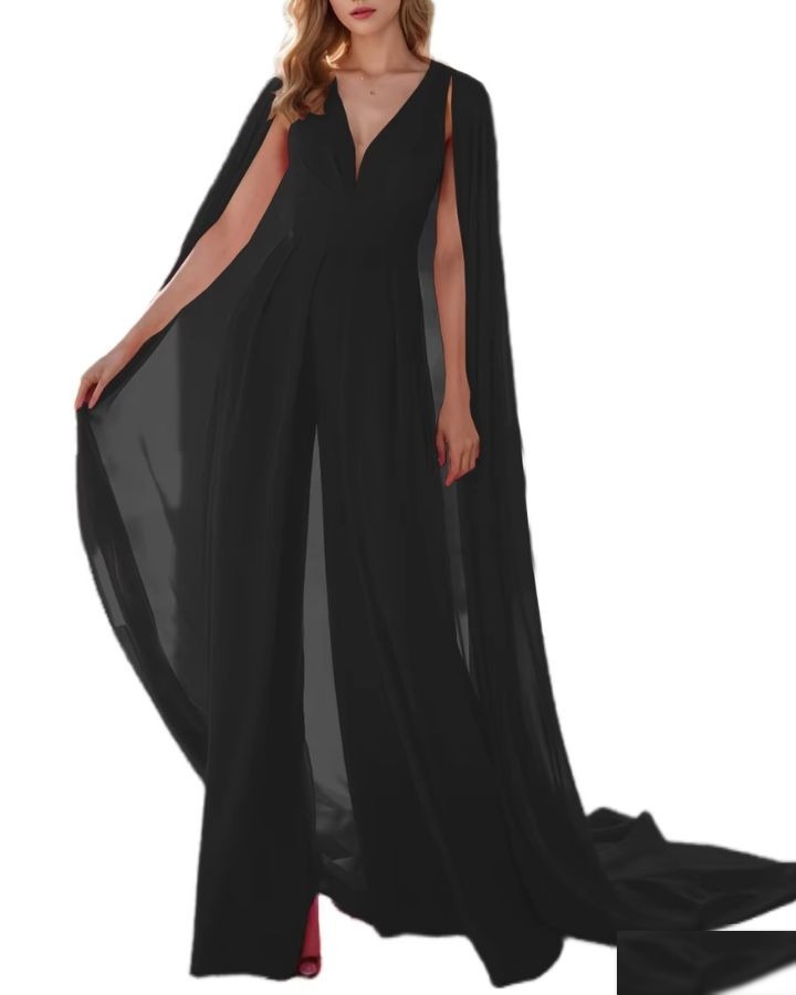 Le bleu marine, c’est le noir en mieux — surtout avec une cape. Cette combinaison bleue marine avec cape est l’arme secrète des invitées de mariage qui veulent un look sophistiqué sans se prendre la tête.