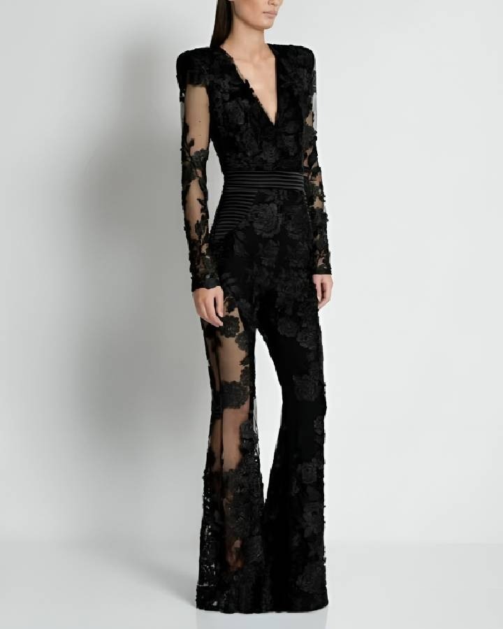 Noir et dentelle : le duo le plus séduisant de la saison. Cette combinaison noire en dentelle combine la sobriété du noir avec la sensualité de la dentelle. Un choix sophistiqué pour les événements qui comptent.