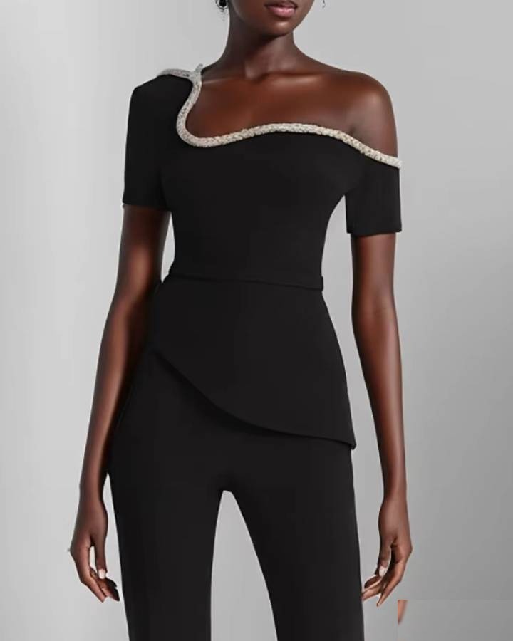 Élégante et audacieuse, cette combinaison noire est un choix parfait pour toutes vos occasions habillées. Son design asymétrique avec un décolleté off-…