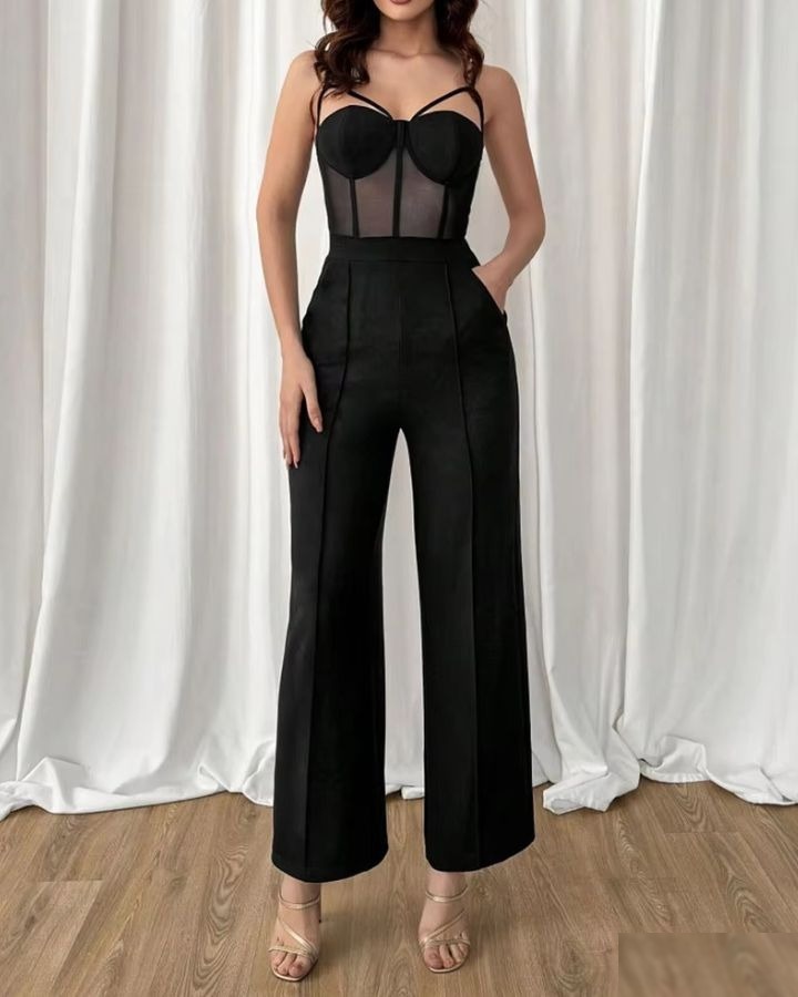 Confectionnée en polyester haute qualité, élasthanne (95% Polyester, 5% Élasthanne), cette combinaison offre un tombé impeccable et un confort absolu. Le style Fluide, Bretelles, Pantalon Large apporte une touche d’élégance intemporelle.