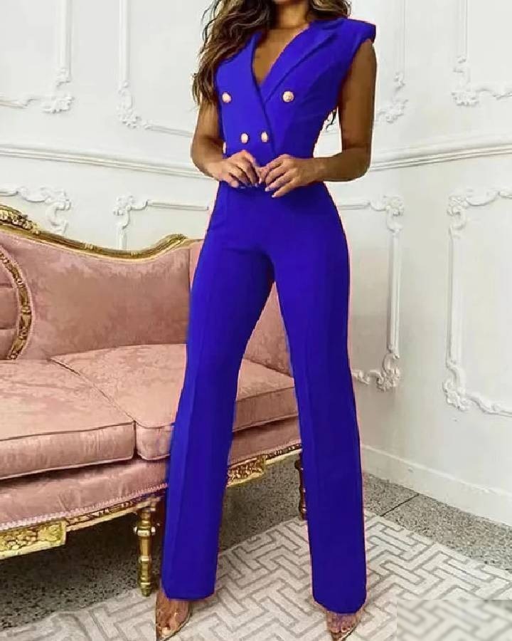 Plonge-toi dans l’élégance audacieuse avec cette combinaison chic pour les grandes occasions. Dotée d’un double boutonnage doré et d’un col en V profond,…